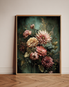 Opulente Dahlienpracht. Komm näher und lass dich überwältigen: Diese Dahlien explodieren förmlich in üppiger Fülle, ihre Blütenblätter elegant wie Seide, schwer von Farbe und Leben. Rosé, Altrosa und Creme tanzen in kraftvoller Harmonie vor einem tiefen, patinierten Grund – ein Feuerwerk der Natur, das Stärke und Zartheit zugleich ausstrahlt